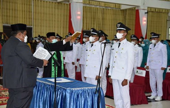 Bupati Padang Pariaman Suhatri Bur sedang mengambil sumpah jabatan sebanyak 28 dari 29 wali nagari yang terplih dalam Pilwana serentak 31 Oktober lalu.