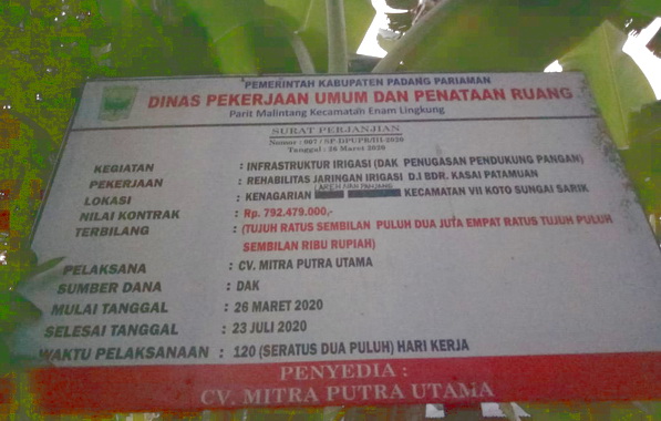 Rehabilitasi jaringan irigasi Bandar Kasai Patamuan dikerjakan oleh rekanan CV. Mitra Putra Utama dengan nilai kontrak senilai Rp 792.479.000. Yang sebelum runtuh sudah diperbaiki sesuai standar Kegiatan Infrastuktur Irigasi Pendukung Pangan di kenagarian Lareh Nan Panjang kecamatan VII Koto Sungai Sariak yang dimulai pengerjaanya 26 Maret 2020 dan selasai 23 Juli 2020,