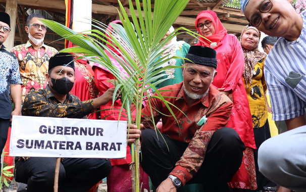 Pessel, Editor.- Gubernur Sumatera Barat Mahyeldi menyerahkan bibit kelapa pandan wangi kepada masyarakat yang berada di Rumah Gadang Kaum Suku Melayu, Kampuang Salido, Kabupaten Pesisir Selatan, Kamis (9/12/2021).