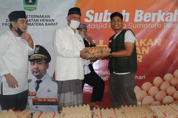 “Hari ini Pemerintah Provinsi Sumbar bersama dengan asosiasi peternak unggas mengampanyekan gerakan ayo makan telur, minimal 2 butir sehari. Melalui asosiasi peternak kita menyerahkan 16 ribu butir telur ayam untuk pesantren, rumah tahfiz, dan panti asuhan di Kota Padang, dan juga ada bazar telur untuk ASN di Pemprov Sumbar,” ujar Mahyeldi, usai Subuh Mubarokah, di Masjid Raya Sumbar.