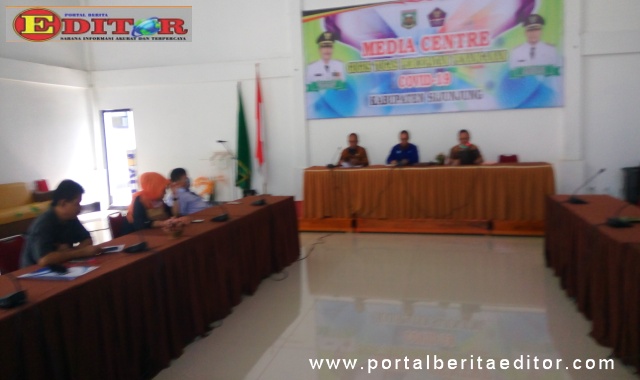 Suasana jumpa wartawan di media center covid-19 di Balairung lansek manih.