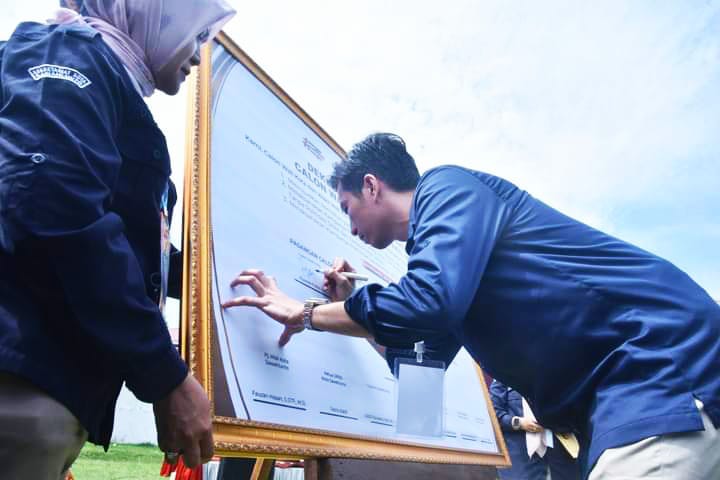 Prosesi Deklarasi Damai ditandai dengan Pengucapan dan Penandatanganan Prasasti oleh Paslon Riyanda Putra – H. Jeffry Hibatullah dan Paslon Deri Asta – Desni Seswinari, sebagai saksi Ketua KPU Hamdani, di Lapangan Bola Kaki Ombilin, Selasa (24/09/2024).