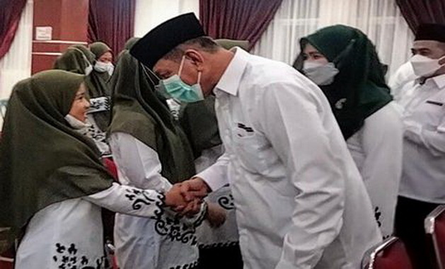 Painan, Editor.- Bupati Pesisir Selatan Rusma Yul Anwar didampingi kepala kantor Kementerian Agama Pesisir Selatan melepas Kafilah Kabupaten Pesisir Selatan untuk mengikuti MTQ Nasional 2021 di Kota Padang Panjang. Jum’at (15/11/2021).