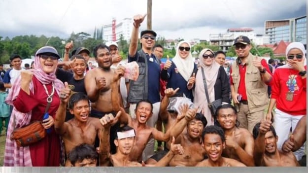 Lomba panjat pinang memperebutkan hadiah uang tunai sebesar Rp3 juta plus hadiah lainnya yang tergantung pada lingkaran yang dibuat di puncak batang pinang.