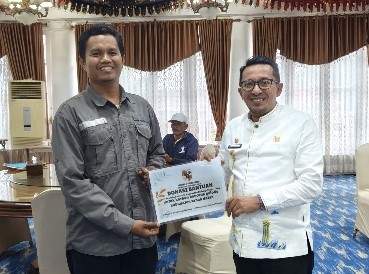 Batusangkar, Editor.- Pemuda Pancasila Kabupaten Indragiri Hulu yang diwakili Harfani memberikan bantuan berupa donasi kepada korban bencana alam banjir bandang dan tanah longsor beberapa waktu yang lalu kepada  Bupati Tanah Datar, Eka Putra, SE.MM di Posko Induk, Indojolito Jum’at (12/7).